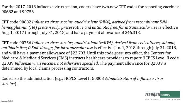 Payment Allowances and Effective Dates for the 2017-2018 Flu Season. Transmittal 3827 Change Request 10196 Dated 08042017 Quarterly Influenza Virus Vaccine Code Update - January 2018 Transmittal 3908 Change Request 10224 Dated 11032017 Influenza Vaccine Payment Allowances - Annual Update for 2017-2018 Season Transmittal 4127 Change Request 10871 Dated 09152018 Quarterly Influenza Virus Vaccine Code Update - January 2019. Administration of influenza virus vaccine allowable same as CPT 90471 90653.